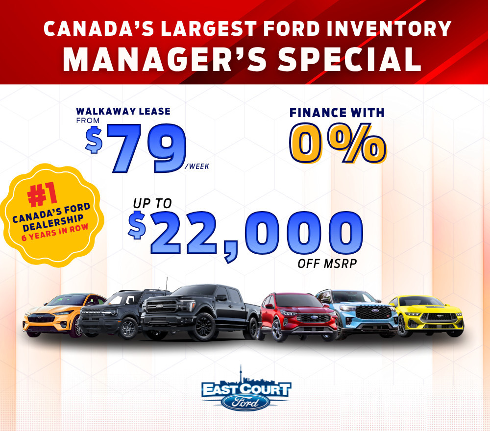 If you’re in the market for a new Ford vehicle, visit East Court Ford Lincoln and experience the difference for yourself. With the highest sales in 2020, 2021, 2022, 2023, 2024 and 2025(YTD) in Canada, you can trust that you’re in good hands at the #1 Ford dealer in the country.